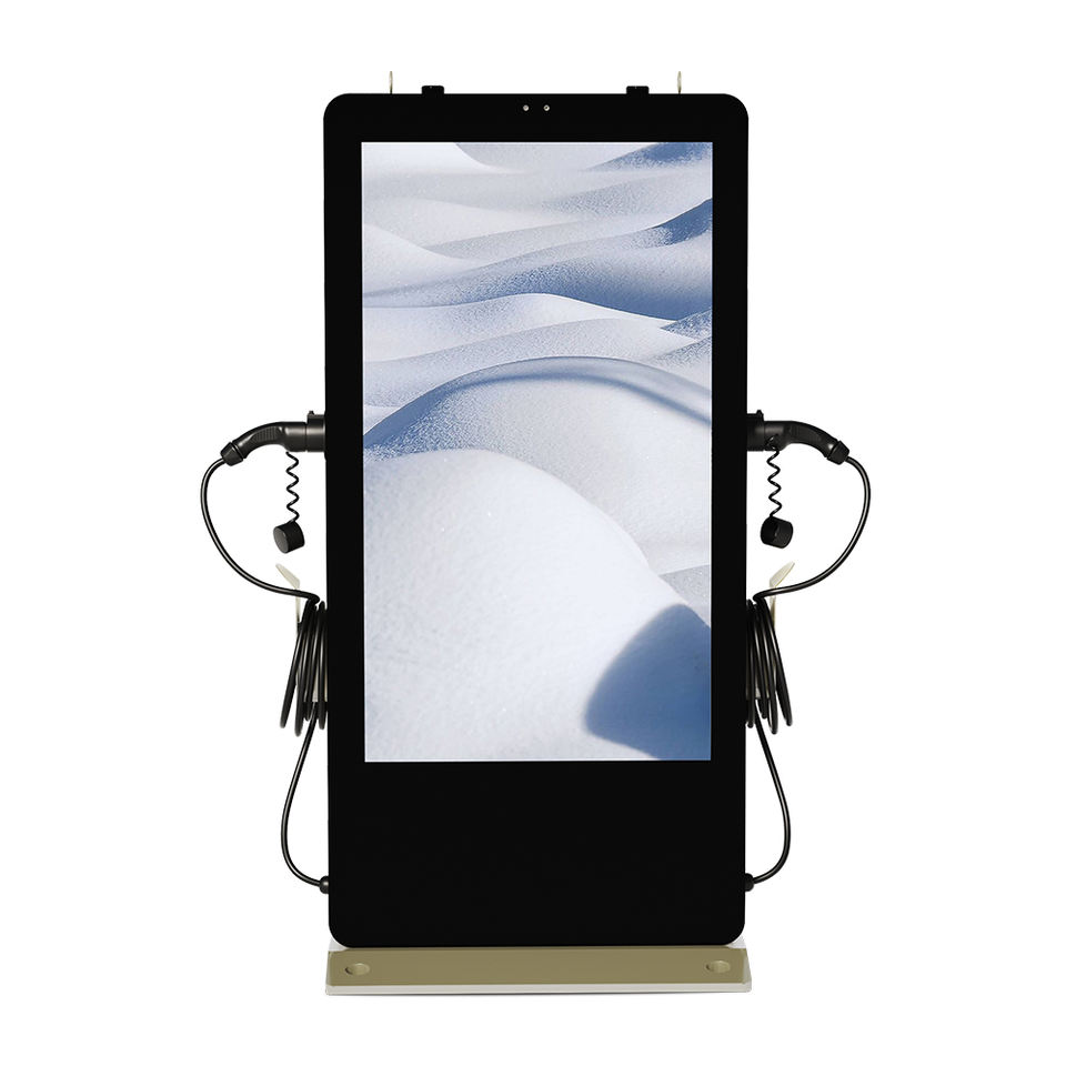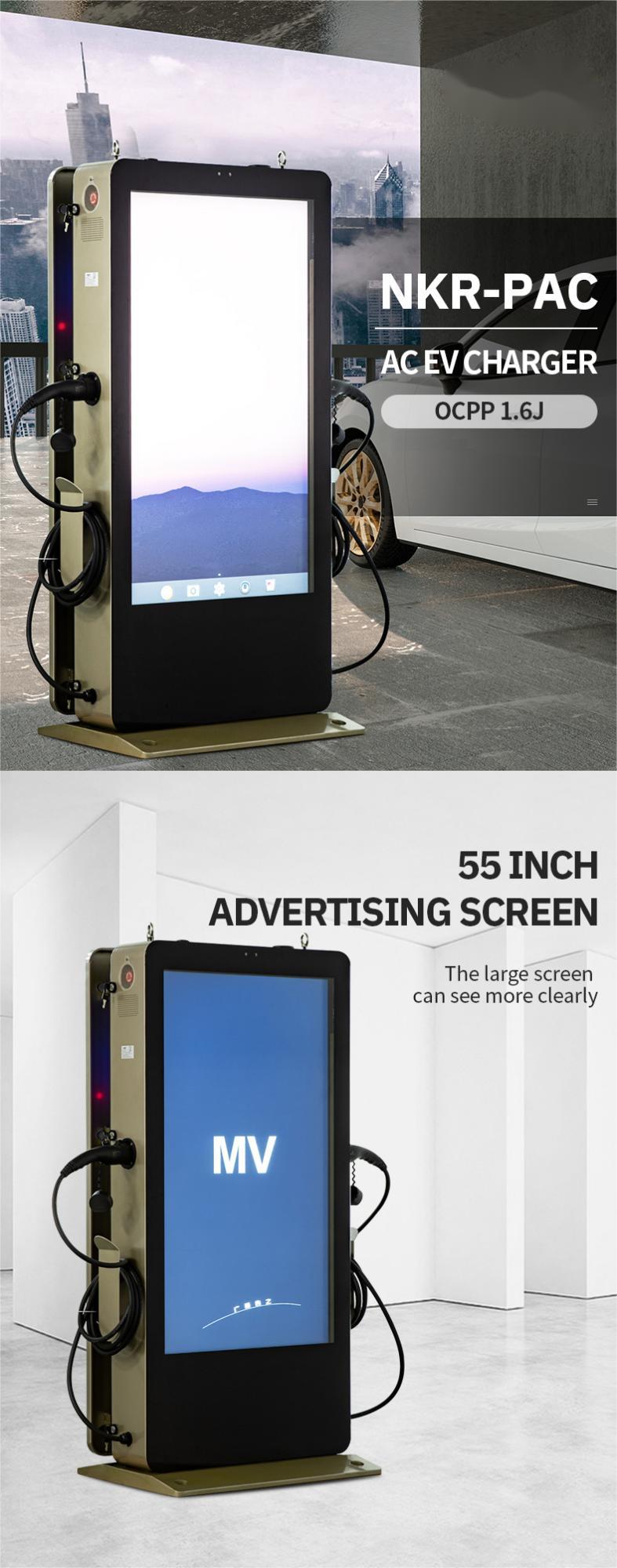 The EV charger is an AC EV charger for commercial use. It uses a 55-inch large-screen display, which can play advertisements while charging, and has high commercial value.The whole machine adopts dustproof and waterproof design, and the protection level reaches IP54, which is not afraid of high temperature and low temperature. It is suitable for commercial squares, charging stations, office buildings and other scenarios.